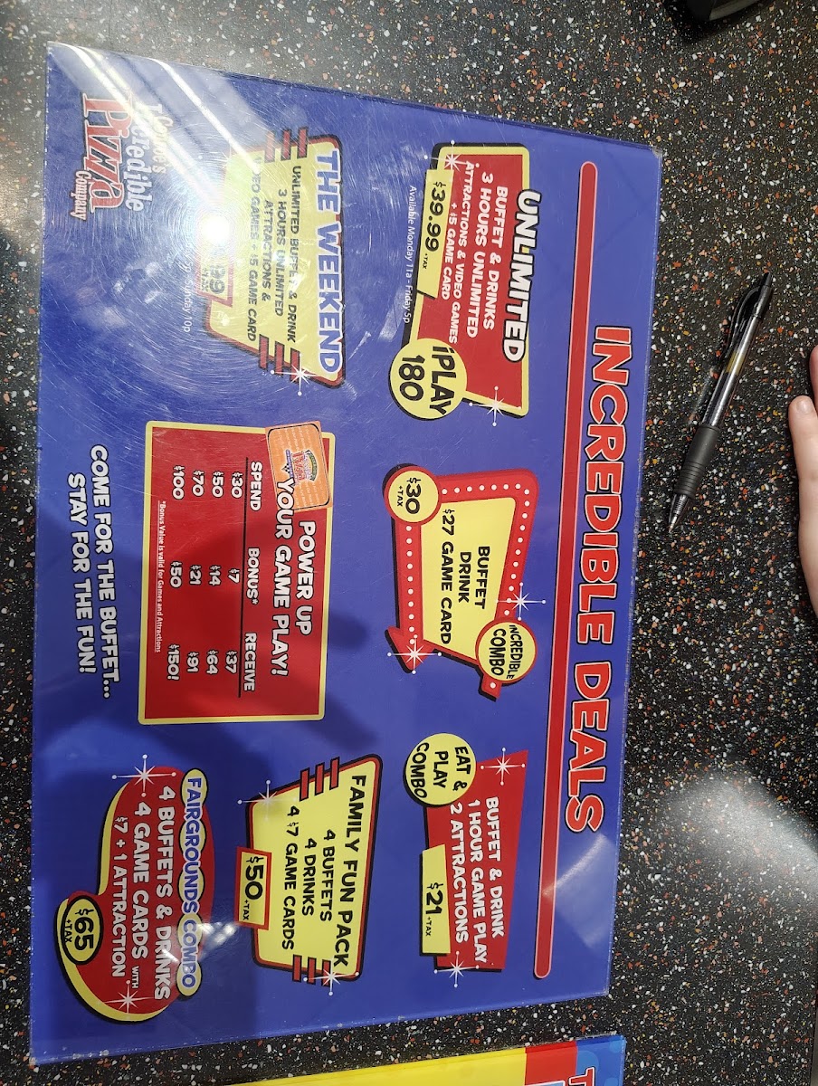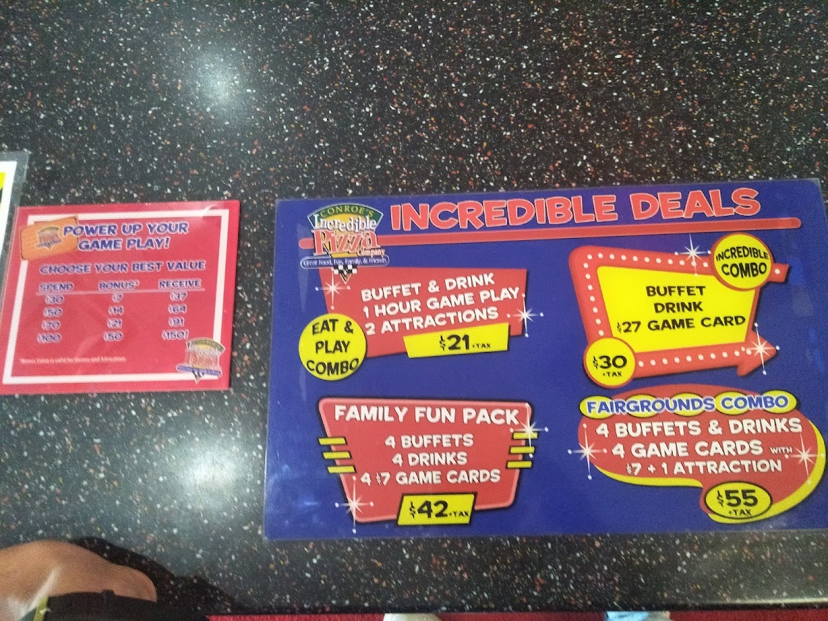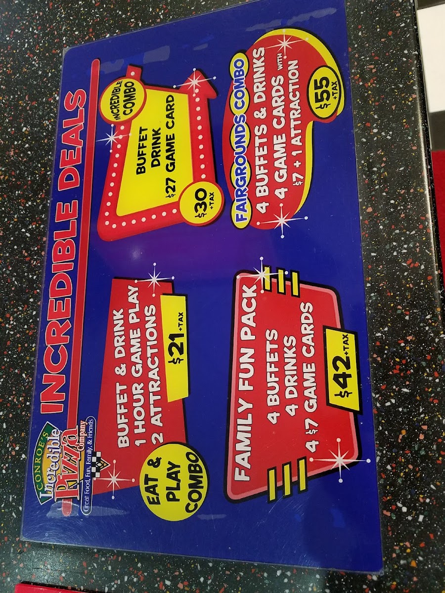 Buffet and drink, 3 hours of unlimited attractions and video game play plus a $5 game card. *Friday through Sunday *no tickets during video play