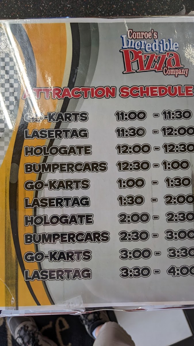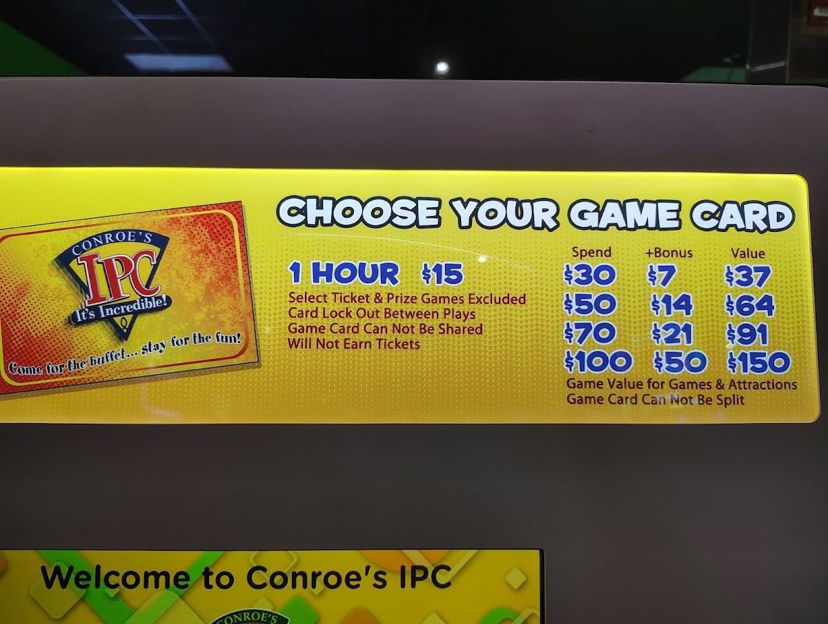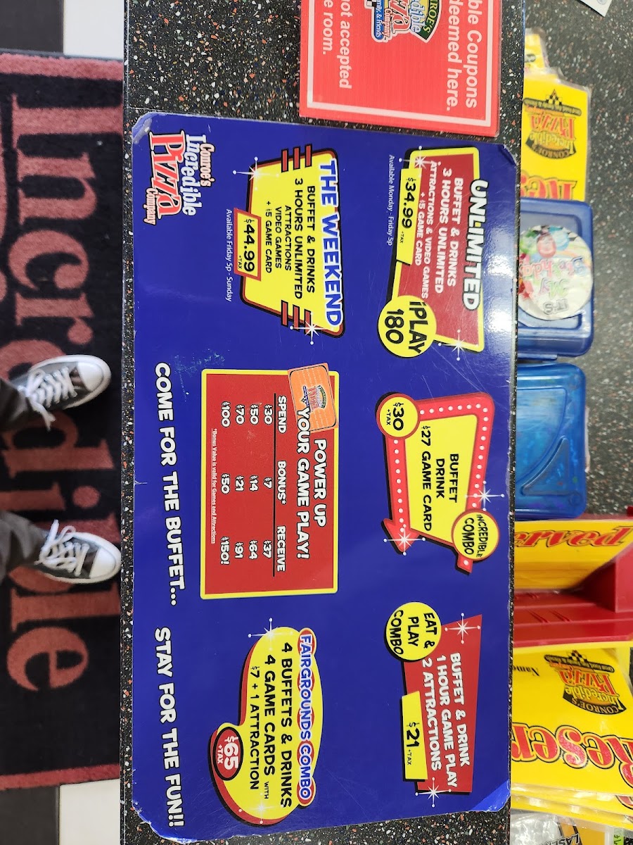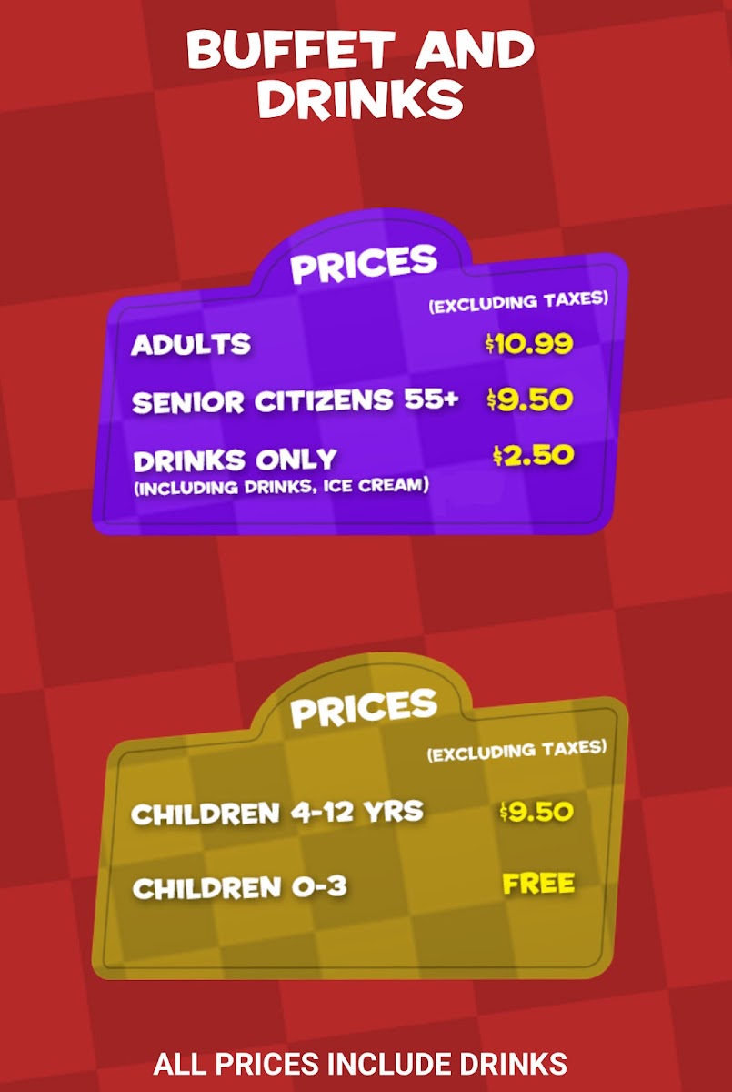 Buffet and drink, 3 hours of unlimited attractions and video game play plus a $5 game card. *Friday through Sunday *no tickets during video play